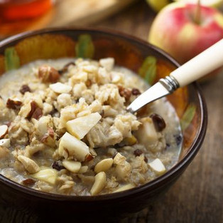 The next morning, grate the apples and mix them into the oats with the mixed nuts and ginger.